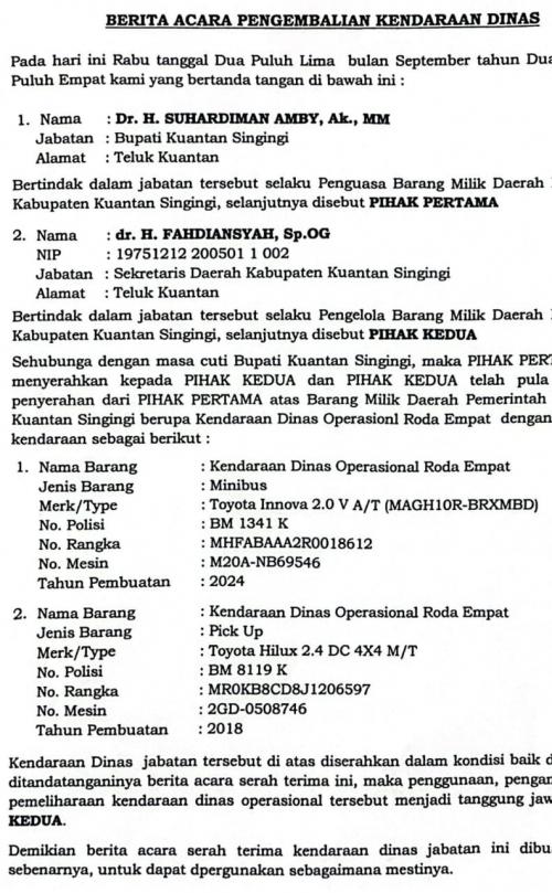 Kamis, 26-09-2024 - 00:17:32 WIB KupasKasus.com, Kuansing - Memasuki masa Kompanye pemilihan Bupati dan wakil Bupati tahun 2024-2029 Bupati petahana Dr. H. Suhardiman Amby- Ak, MM menyerahkan mobil operasional jabatan Bupati kepada Sekretaris Daerah Dr. Fahdiansyah SP. OG Rabu (25/9/2024) di halaman kantor Bupati Taluk Kuantan.Penyerahan dua unit kendaraan operasional...(read more)
