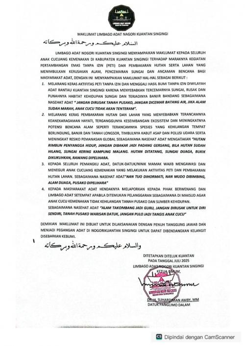 Kamis, 07-08-2025 - 01:43:24 WIB KupasKasus.com, Teluk Kuantan – Lembaga Adat Nagori (LAN) Kuantan Singingi mengeluarkan maklumat resmi yang melarang keras kegiatan Pertambangan Emas Tanpa Izin (PETI) serta pembakaran hutan dan lahan di wilayah adat. Maklumat tersebut diterbitkan sebagai bentuk keprihatinan atas kerusakan lingkungan yang dinilai kian mengkhawatirkan dan...(read more)