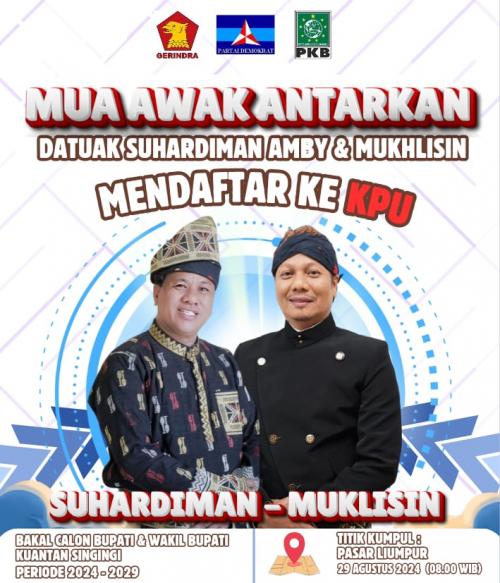 Rabu, 28-08-2024 - 13:57:46 WIB KupasKasus.com, Kuansing - Pasangan Suhardiman Amby-Muklisin Direncankan akan diarak oleh ribuan pendukung dan Masyarakat Kab Kuansing menuju ke kantor KPU Kuantan Singingi, Besok Pagi Kamis (29/8 2024) sekitar pukul 08.00 pagi, Guna Mendaftarkan sebagai Calon Bupati dan Wakil Bupati Pada Pilkada tahun 2024. Hal ini merupakan bagian dari...(read more)