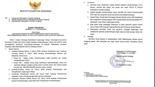 Rabu, 30-07-2025 - 00:59:00 WIB KupasKasus.com, Teluk Kuantan – Pemerintah Kabupaten Kuantan Singingi resmi mengeluarkan Surat Edaran Nomor 1714 Tahun 2025 yang melarang keras seluruh aktivitas Pertambangan Tanpa Izin (PETI) di wilayah tersebut. Surat tersebut ditandatangani Bupati H. Suhardiman Amby pada 19 Juli 2025 dan ditujukan kepada para camat, kepala desa/lurah,...(read more)