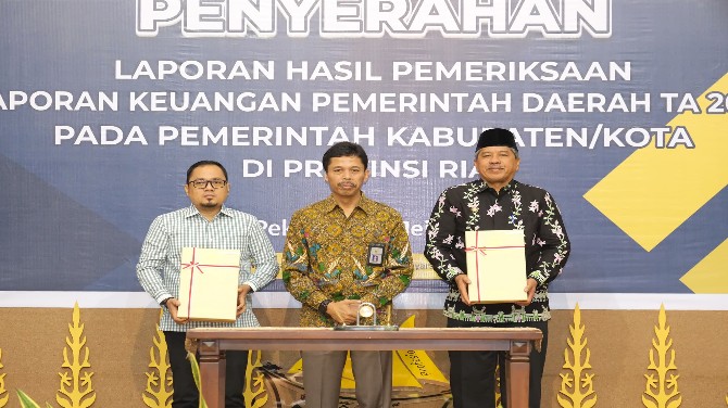 "Bapak dan ibu sekalian, hari ini saya menyerahkan laporan keuangan kepada bapak ibu dengan opini WTP. Insya Allah ini sudah sekian kalinya dan alhamdulillah membuat bahagia, karena sebelum diserahkan sudah tahu yakin akan WTP yang artinya bahwa pengelolaan keuangan di lingkungan bapak ibu sekalian sangat baik," ucap Kepala Perwakilan BPK RI Perwakilan Provinsi Riau tersebut.