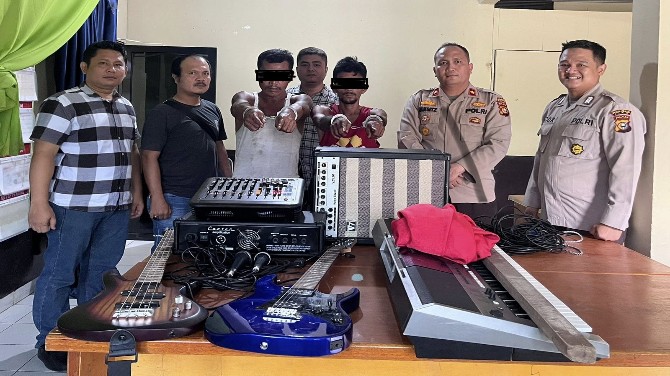 Adapun barang bukti yang berhasil diamankan dari kedua pelaku kata Kapolsek, diantaranya iya lah, 1 unit keyboard merek Yamaha, 1 unit Ampli Bass merek Carter Bass 10B, 1 unit Gitar Bass Gillmore GB 150, 1 Unit Gitar listrik Merek Gio Ibanez, 1 unit Ampli Mixer, 1 Unit Loudspeaker, 2 Unit Microphone kabel, 1 Unit sepeda motor Merek Honda beat, 1 batang kayu Broti panjang kurang lebih 1 meter, 1 buah obeng warna oren hitam yang ujung kepala obeng telah patah dan sehelai gorden warna merah.