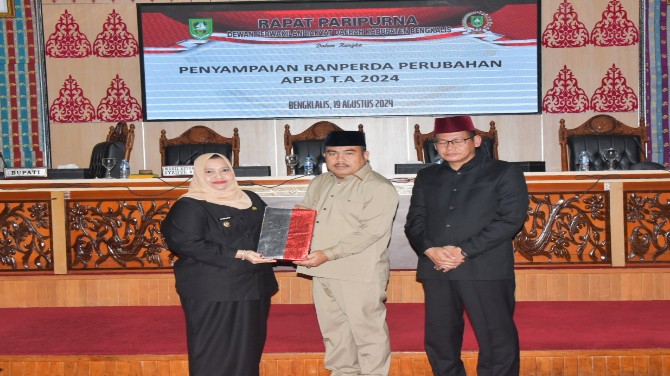 KupasKasus.com, Bengkalis - Bupati Bengkalis Kasmarni menyampaikan Rancangan Peraturan Daerah (Ranperda) APBD Perubahan tahun anggaran 2024, Senin 19 Agustus 2024, di ruang rapat Paripurna DPRD Kabupaten Bengkalis.