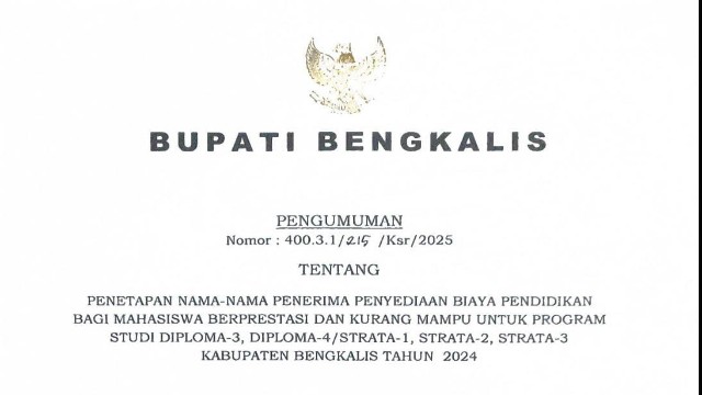 Surat pengumuman tersebut sebagai tindak lanjut dari Surat Keputusan Bupati Bengkalis nomor: 712/KPTS/XII/2024 tanggal 31 Desember 2024 tentang penetapan nama-nama penerima beasiswa berprestasi maupun kurang mampu.
