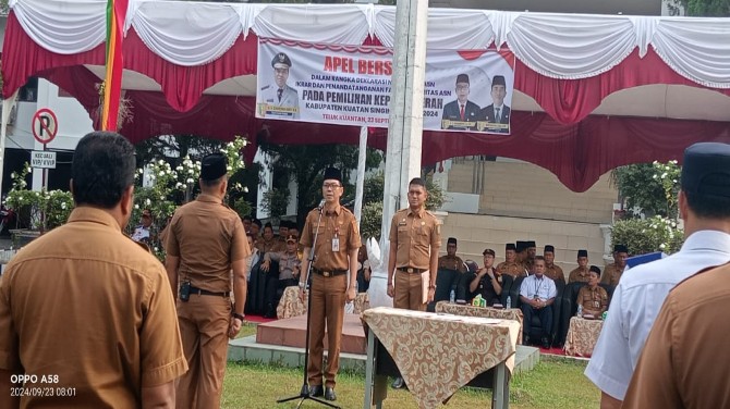 KupasKasus.com, Kuansing - Apel Deklarasi Netralitas ASN dalam Penyelenggaraan Pilkada tahun 2024 dipimpin oleh Sekretaris Daerah Kabupaten Kuantan Singingi Dr. Fahdiansyah SPOG Senin (23/9/2024) di Lapangan Upacara Kantor Bupati Kuantan Singingi.