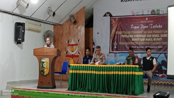 KupasKasus.com, Kuansing - Rapat Pleno Terbuka Rekapitulasi pemungutan Dan perhitungan Suara Pemilihan Gubernur/wakil Gubernur Bupati dan wakil bupati Kabupaten kuntan Singingi Tahun 2024 Jumat (29/11 2024) di gedung serbaguna Narosa Taluk Kuantan.