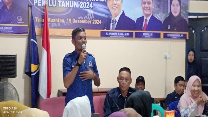 KupasKasus.com, Kuansing - DPD Partai Nasdem Kabupaten Kuantan Singingi gelar kegiatan Dialog Interaktif dengan tema Peran Perempuan terhadap Pesta Demokrasi Pemilu Tahun 2024 Kamis (19/12/2024) di buka secara langsung oleh Ketua DPD Partai Nasdem Kuantan Singingi Muslim, S.sos, MSi, yang di wakilkan oleh Wakil Ketua Bapilu Mahmudin yang Di ikuti oleh Kader, Pengurus cabang dan ranting dari perwakilan perempuan Partai Nasdem, lebih kurang 100 orang di kantor DPD Partai Nasdem Taluk Kuantan.