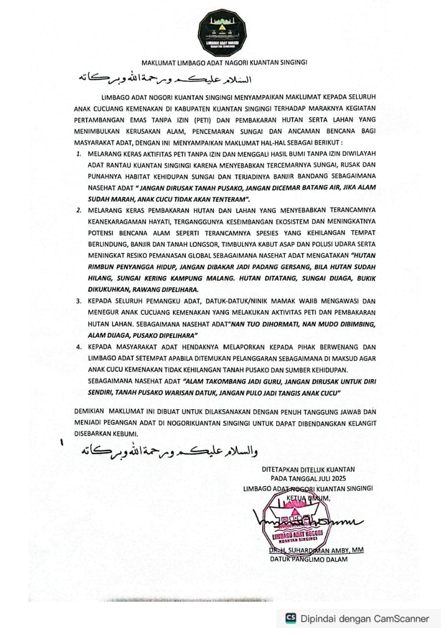 KupasKasus.com, Teluk Kuantan – Lembaga Adat Nagori (LAN) Kuantan Singingi mengeluarkan maklumat resmi yang melarang keras kegiatan Pertambangan Emas Tanpa Izin (PETI) serta pembakaran hutan dan lahan di wilayah adat. Maklumat tersebut diterbitkan sebagai bentuk keprihatinan atas kerusakan lingkungan yang dinilai kian mengkhawatirkan dan mengancam keberlangsungan hidup masyarakat adat.