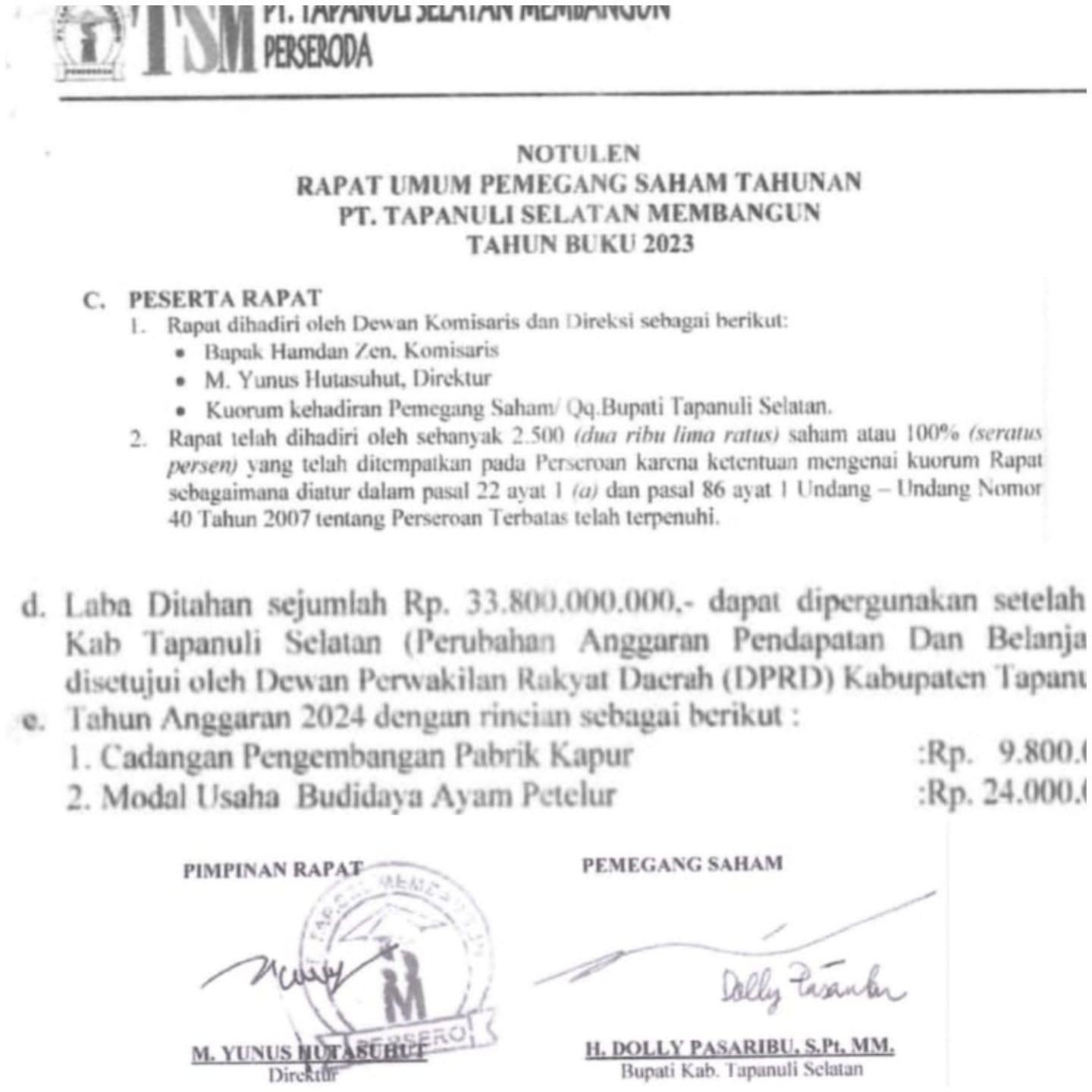 Rapat Umum Pemegang Saham (RUPS) PT. TSM pada 22 Mei 2024 memutuskan penggunaan laba bersih Rp62.338.453.354, termasuk alokasi untuk proyek pabrik kapur (Rp9,8 miliar) dan budidaya ayam petelur (Rp24 miliar). Notulen RUPS menyebutkan kedua proyek tersebut baru dapat dimulai setelah mendapat persetujuan DPRD Tapsel melalui Perubahan APBD 2024. Namun, perubahan APBD 2024 tidak pernah disetujui DPRD, sementara proyek tersebut telah berjalan.