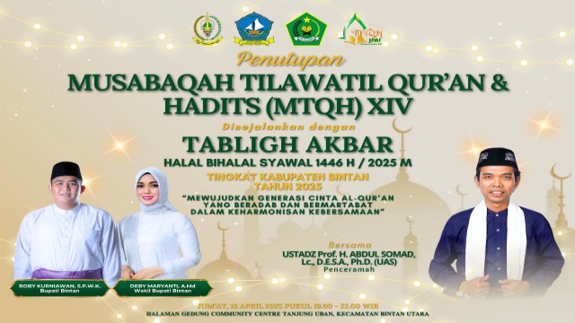 Kegiatan tersebut akan disejalankan dengan Tabligh Akbar Halal bi Halal Syawal yang menghadirkan Ulama Kharismatik Ustadz Prof. H. Abdul Somad, Lc, D.E.S.A, Ph.D sebagai Penceramah. Berkenaan hal tersebut, Bupati Bintan Roby Kurniawan menyampaikan undangan terbuka bagi seluruh masyarakat untuk turut hadir dan menyaksikan kemeriahan Malam Penutupan MTQH Ke XIV Bintan.