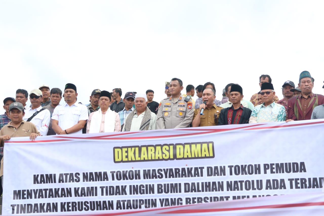 Selanjutnya seluruh yang hadir dan berkumpul di Taman Demokrasi itu mengikrarkan deklarasi damai. Atas nama masyarakat Tapanuli Selatan, mereka siap menjaga keamanan dan ketertiban yang kondusif.