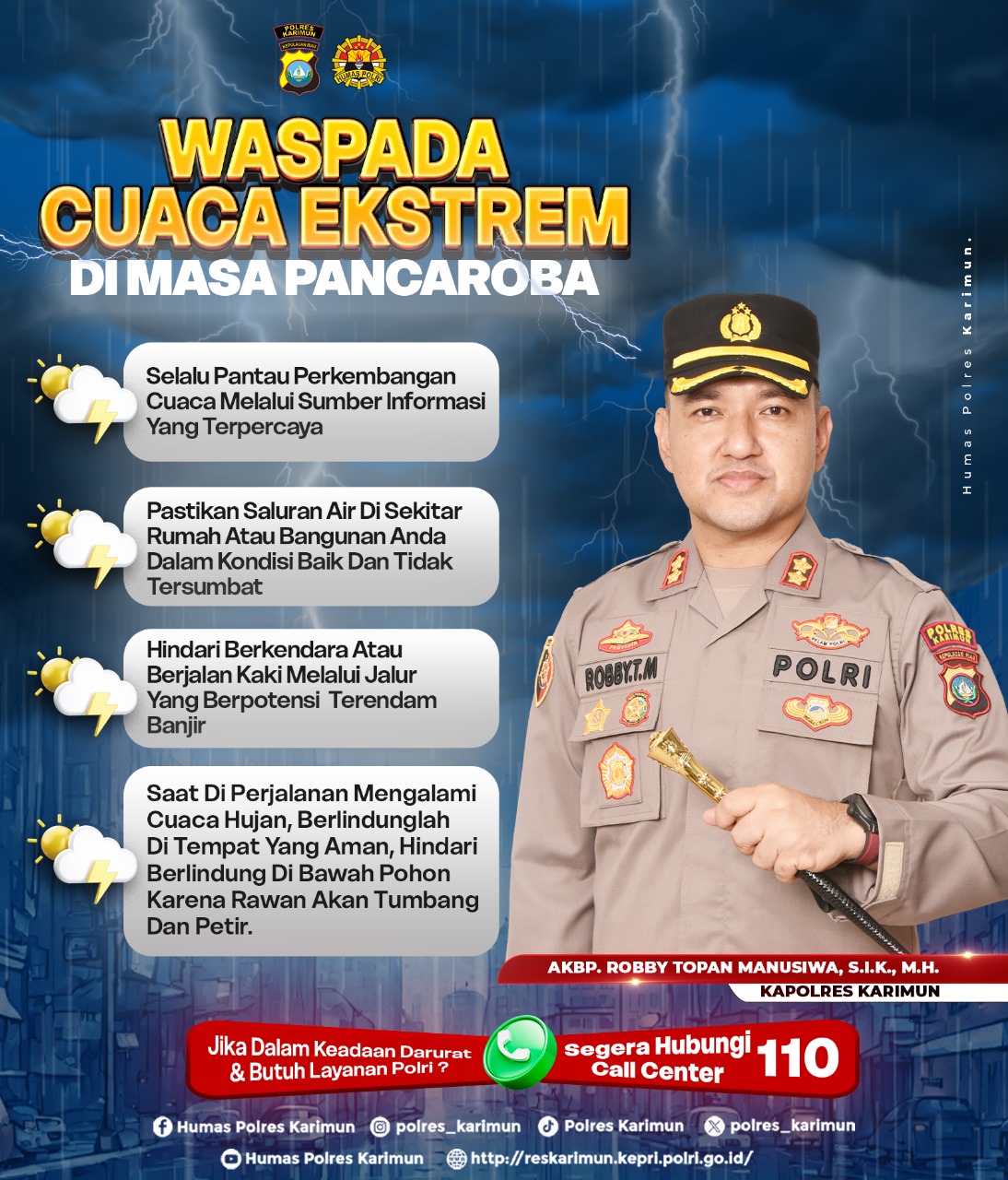 KupasKasus.com, Karimun Kepri – Polres Karimun melalui Kapolres Karimun, AKBP Robby Topan Manusiwa, S.I.K., M.H., mengimbau kepada seluruh masyarakat agar meningkatkan kewaspadaan terhadap potensi cuaca ekstrem di masa pancaroba.