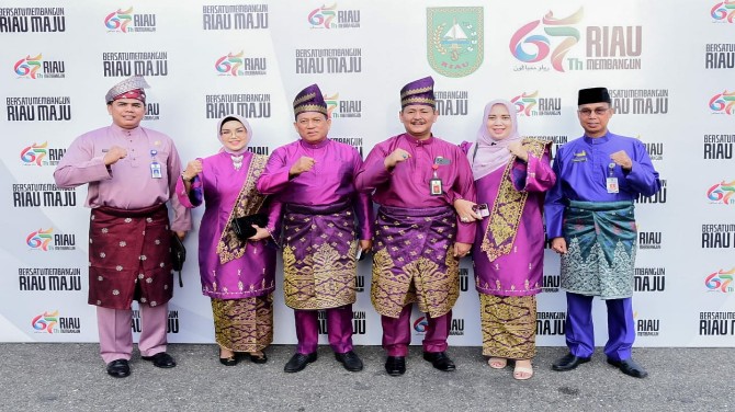 Asisten Ekonomi dan Pembangunan Setda Bengkalis Toharuddin dengan mengenakan pakaian melayu lengkap dengan tanjak langsung disambut petinggi Provinsi Riau.
