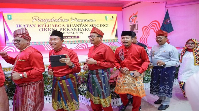 KupasKasus.com, Pekanbaru - Pada momentum pelantikan pengurus Ikatan Keluarga Kuantan Singingi (IKKS) Pekanbaru, terlihat Pj Gubernur Riau (Gubri), Rahman Hadi bersama Bupati Kuantan Singingi (Kuansing), Suhardiman Amby kompak menarikan tarian Randai Kuantan.