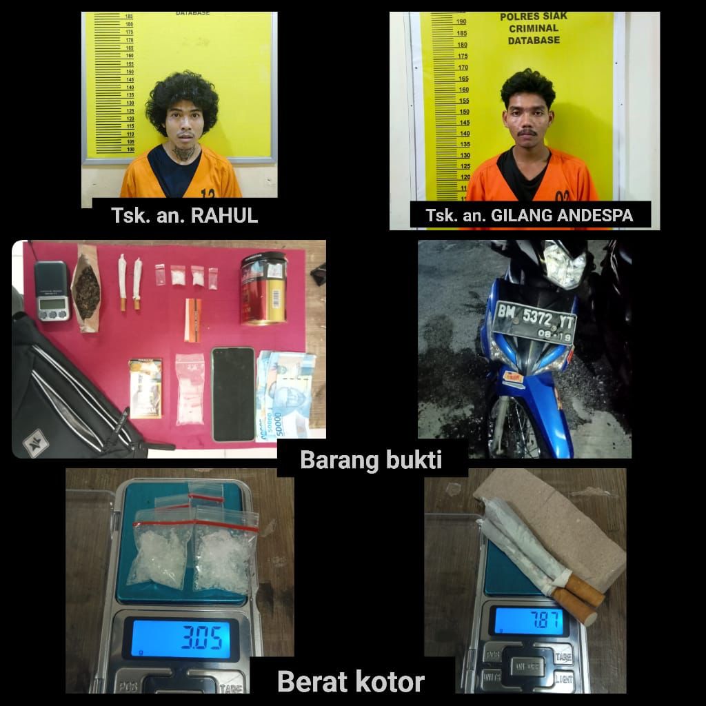 R (23) dan GA (22) diamankan Satres Narkoba Polres Siak dengan barang bukti 4 (empat) paket diduga Narkotika Jenis Shabu dengan berat kotor 3,05 (tiga koma nol lima) gram dan 3 (tiga) paket diduga narkotika jenis Daun Ganja Kering  dengan berat kotor 7,87 (tujuh koma delapan puluh tujuh) gram.