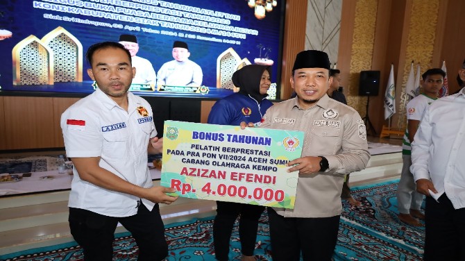 Penyerahan bonus tahunan diserahkan secara simbolis oleh Bupati Siak Alfedri MSi didampingi Ketua Umum KONI Siak Husni Merza MM pada acara buka puasa bersama keluarga KONI Kabupaten Siak Tahun 2024 di Balairung Datuk Empat Suku Komplek Abdi Praja Siak Sri Indrapura, Rabu (3/4/2024).