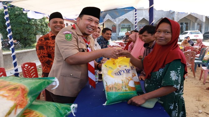 Wakil Bupati Siak Husni Merza hadir di dampingi Kepala Dinas Dinas Perindustrian dan Perdagangan kabupaten Siak Tengku Musa turut membantu menyerahkan beras kepada warga yang sudah menukar kupon pembelian.(r/sh.s)