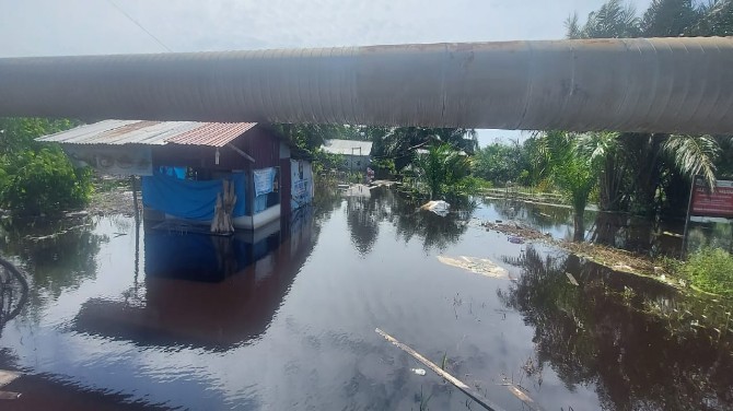 Genangan air menyentuh lutut orang dewasa, Banjir yang paling parah terjadi di dua RT yaitu di RT 05, 06 termasuk simpang obor jalan lintas Provinsi arah Tanjung Buton akibatnya, pengendara sulit melintasi jalan tersebut karena air yang cukup dalam.