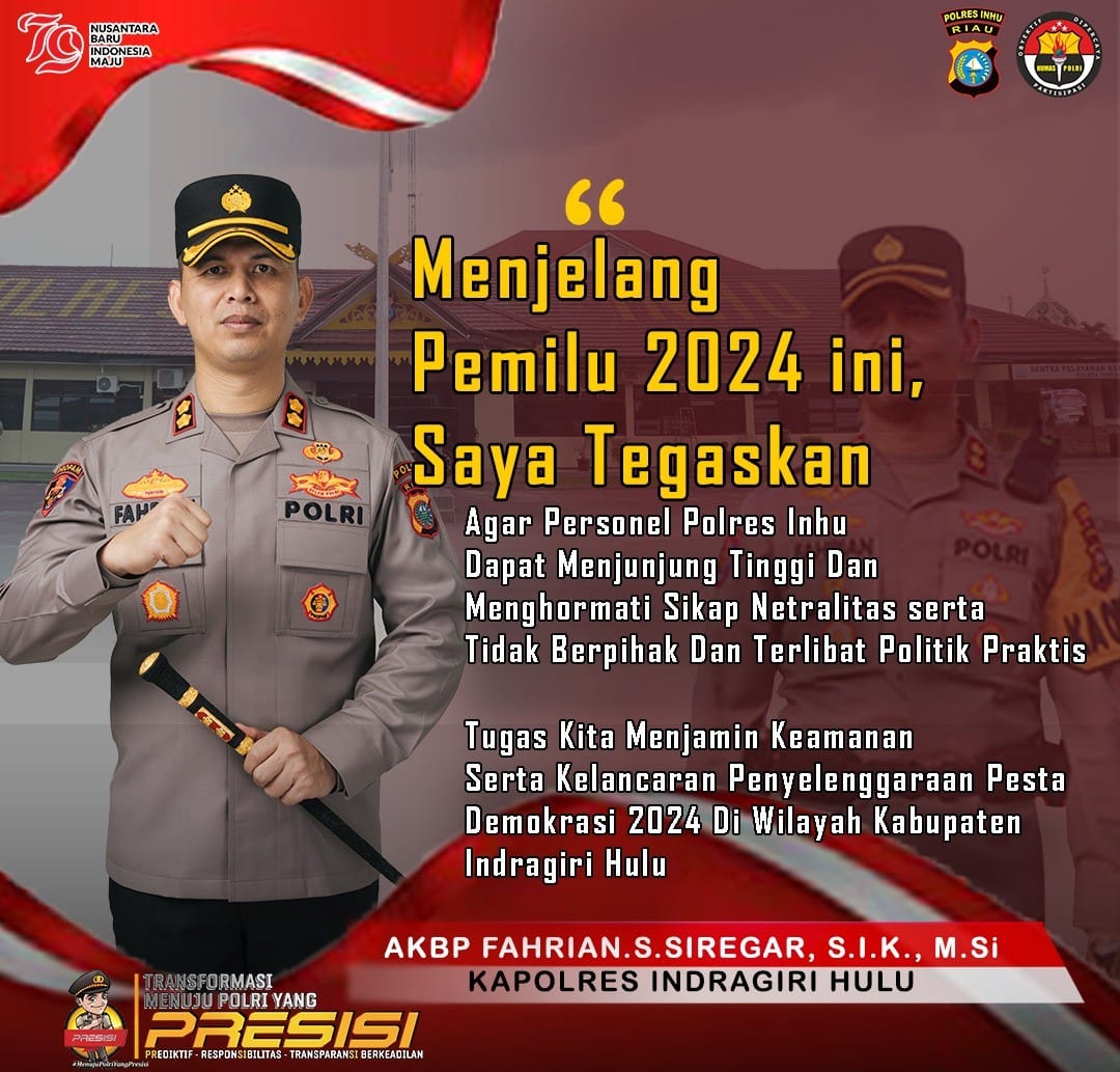KupasKasus.com, Rengat - Dalam rangka menjelang Pemilihan Umum Kepala Daerah (Pemilukada) 2024 yang akan digelar November 2024 mendatang, Kapolres Inhu AKBP Fahrian Saleh Siregar mengeluarkan beberapa point penting penegasan dan himbauan kepada seluruh personel Polres Inhu.