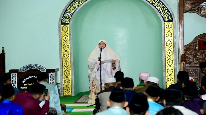 Bupati bergelar Kanjeng Mas Tumenggung Kasmarni Purbaningtyas ini tiba di Masjid Istiqomah Bengkalis bersama keluarga dengan tampak ceria dan ramah menyapa warganya yang lebih dulu tiba di lokasi shalat Ied.