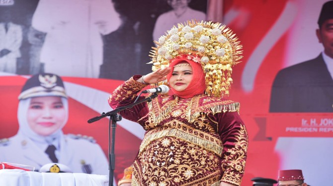 Selaku inspektur upacara, Bupati Kasmarni tampak anggun mengenakan baju adat Minang Kabau berwarna merah.