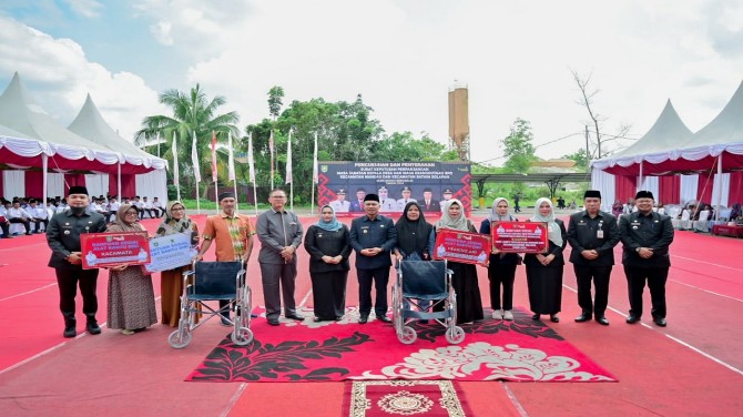 KupasKasus.com, Bengkalis - Bupati Kasmarni didampingi Wakil Bupati H. Bagus Santoso menyerahkan bantuan sosial berupa alat bantu diri, seperti kursi roda, kaca mata, kaki palsu, tangan palsu, hearing aid, penampungan air hujan dan sarana prasarana panti asuhan.