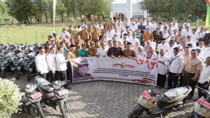 KupasKasus.com, Kuansing - Pemerintah Kabupaten Kuantan Singingi melaksanakan penyerahan bantuan operasional sebanyak 108 unit kendaraan roda dua untuk Para Perangkat Desa dan BPD Se Kabupaten Kuantan Singingi yang langsung di serahkan oleh Bupati Kuantan Singingi Dr Suhardiman Amby- AK, MM, serta Di dampingi  staf ahli, asisten, Kepala Dinas Sosial PMD, Kabag Umum, dan Kabid Aset BPKAD. Pada hari Rabu (18/9 2024) di halaman kantor Bupati Kuantan Singingi.