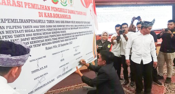 Teks foto : Ketua DPRD Rohil Maston saat menandatangani Deklarasi Pemilu Damai