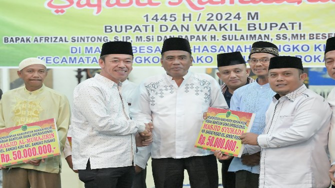Dalam kegiatan safari Ramadhan kali ini, usai melaksanakan sholat Isya Bupati Afrizal Sintong didampingi Kepala OPD menyerahkan bantuan dana operasional untuk beberapa mesjid diantaranya Masjid Al Hasanah  Bangko kiri, Masjid Al Watoniah Teluk Bano 1, Masjid Syuhada Bangko Pusako, Masjid Al Muhajirin Kelurahan Bangko kiri, Masjid Al Falah Kepenghuluan Bangko kiri.