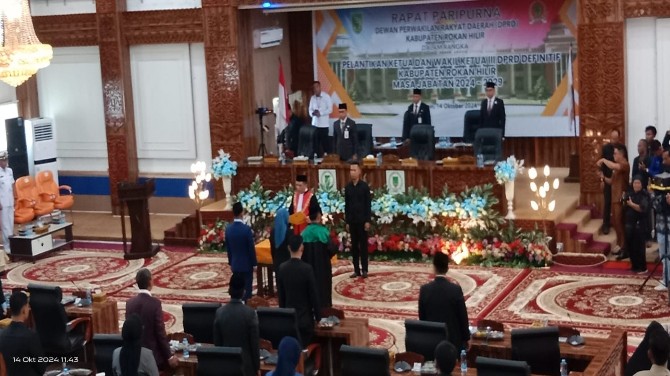 KupasKasus.com, Rokan Hilir - Dewan Perwakilan Rakyat Daerah (DPRD) Kabupaten Rokan Hilir (Rohil) melaksanakan rapat  paripurna pelantikan serta pengambilan sumpah/janji pimpinan DPRD masa jabatan 2024-2029, Senin (14/10/2024).