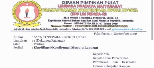“Kita sudah melayangkan surat Klarifikasi melalui lembaga kita LSM Pepara RI kepada Dinas Perkebunan Pertenakan dan Kesehatan Hewan, dengan nomor: 007/KT/ PEPARA-RI/PKU/IX/2022, tertanggal 13 September 2022.  Namun sangat disayangkan pihak lembaga kita masih belum mendapatkan jawaban secara resmi dari instansi terkait,”  kesalnya.